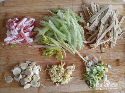 把猪五花肉切成条,芹菜去筋斜切成片,干豆腐洗净切成条,葱切葱花,姜切丝,蒜切成片。
