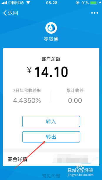 点击之后会出现零钱通的转账对话框,然后我们点击对话框中的“转出”按键。