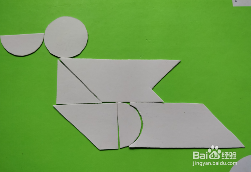 最后在下侧半圆形的右侧,放上曲形板挨着,如图。这样一只鸳鸯就拼好了。