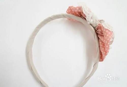 将发箍用丝带包裹一圈,包裹一截打一点胶在上面,这是为了固定丝带,防止中间手劲松动,包裹的不紧。最后将蝴蝶结粘到合适的位置,发箍就制作好了。