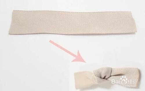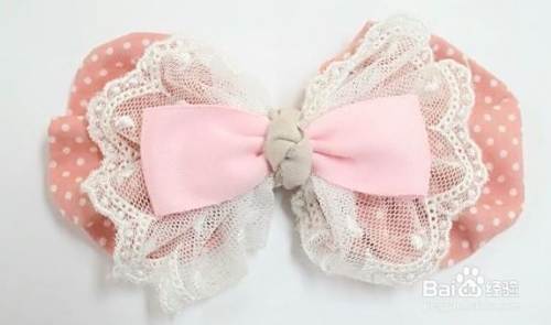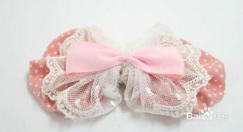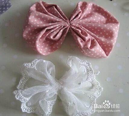 取一段丝带,做一个小蝴蝶结,将它缝到蕾丝布料上面。然后取一段布带,在中间打一个结,用来绑在蝴蝶结中间。