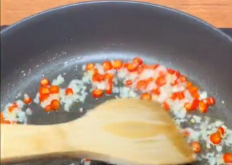 在捞出豆腐之后,将锅中过多的油倒出来,只留底油;然后倒入之前切好的小米椒,翻炒15秒