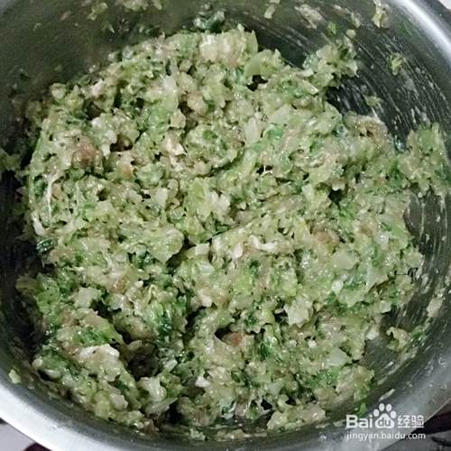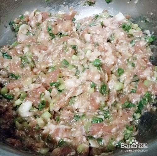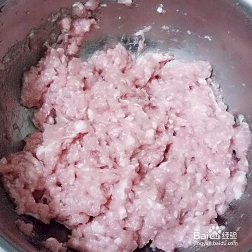 肉馅放入盆中,放入料酒,高汤顺一个方向搅拌均匀,使高汤充分融入到肉馅中,放入葱,姜,盐,生抽,调馅料,味素搅拌均匀,放入食用油搅拌均匀,放入香油搅拌均匀。