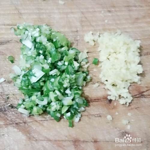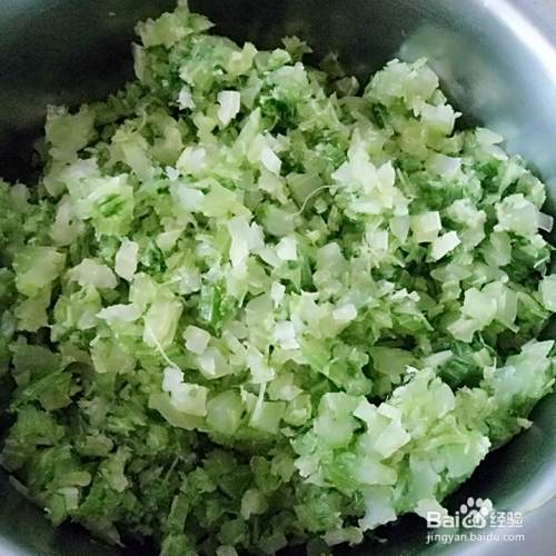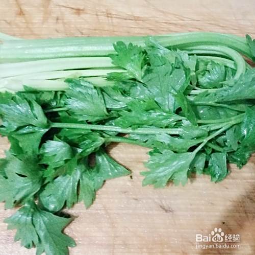 芹菜摘洗干净,用开水焯一下,用手指掐一下芹菜梗,能掐动就可以,捞出放入凉水中过凉,切碎挤干水分备用。
