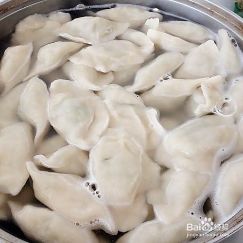 锅中烧开水,放入包好的饺子,用勺子沿着锅边滑动,以免饺子粘连,大火烧开放入半碗凉水,在烧开,再倒入凉水,捞出一个饺子用手指点一下饺子肚,饺子皮和饺子馅分开了,饺子就煮好了。