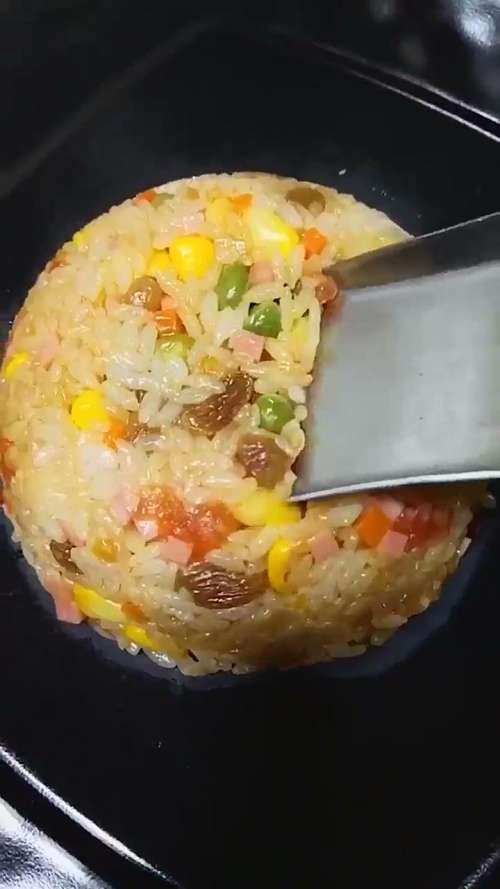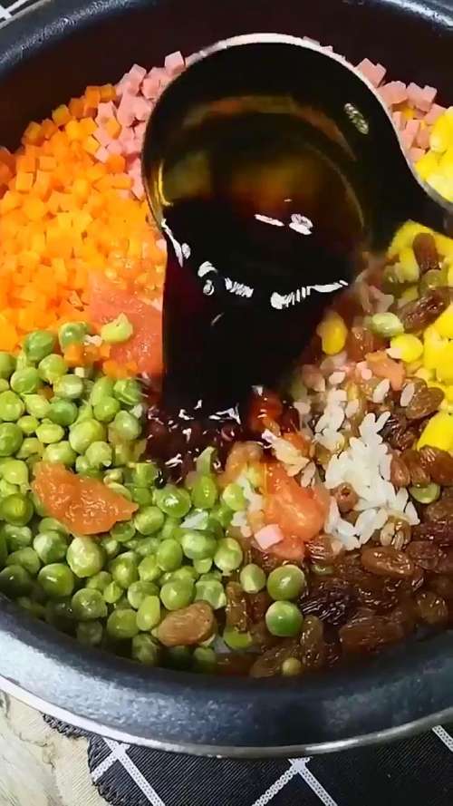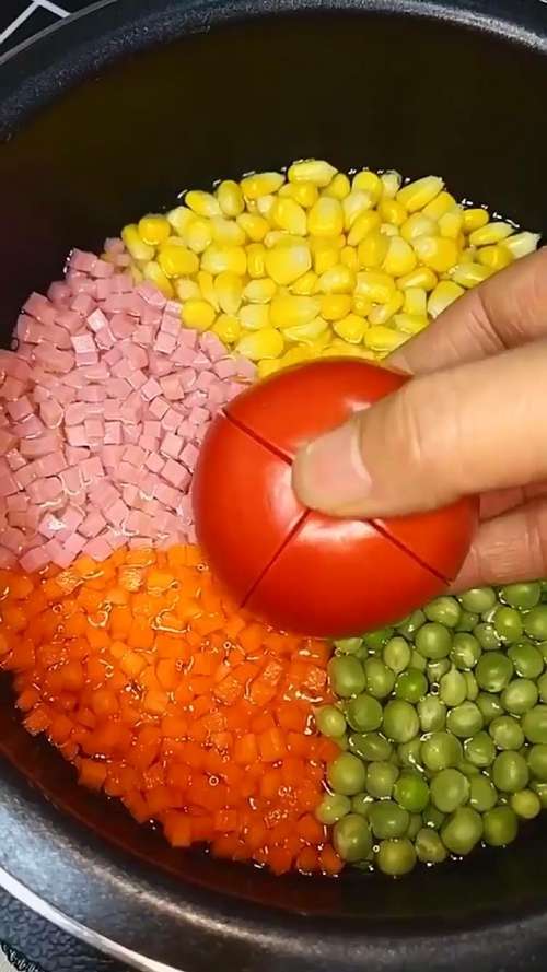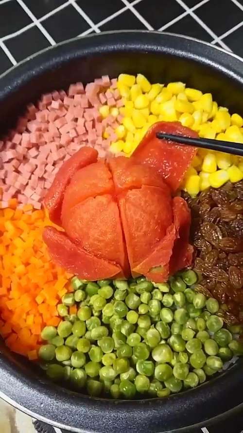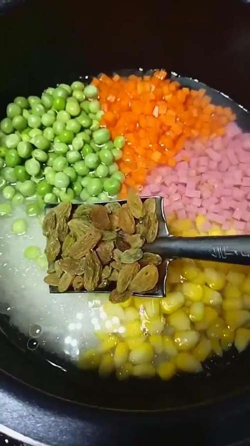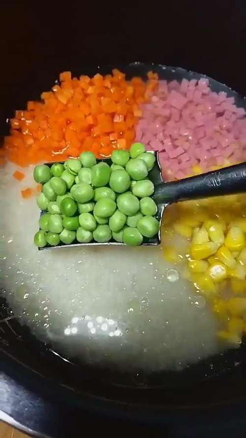 4加入玉米粒、火腿丁、胡萝卜丁、豌豆。