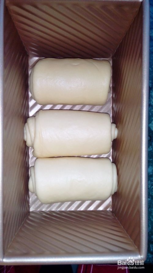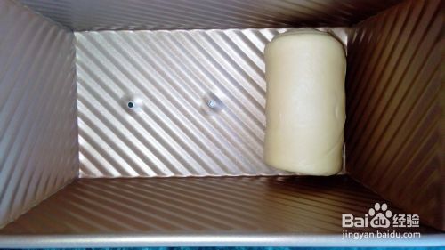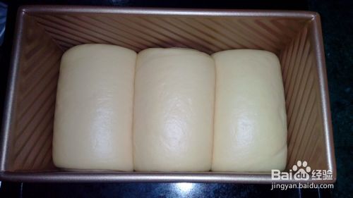 再次发酵。发到吐司盒三分之二的部位。也可以盖上吐司盖子放到烤箱里调到发酵档,烤箱底部放一碗温水,当水凉后要记得换水哦。