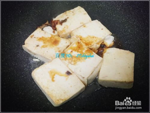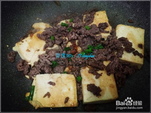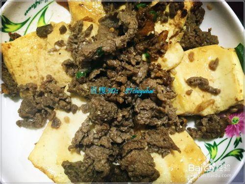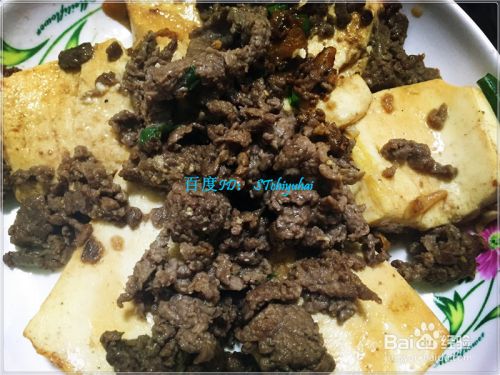 水豆腐稍微煎一会,添加少许盐、酱油、料酒,然后在上端铺上炒好的牛肉末。