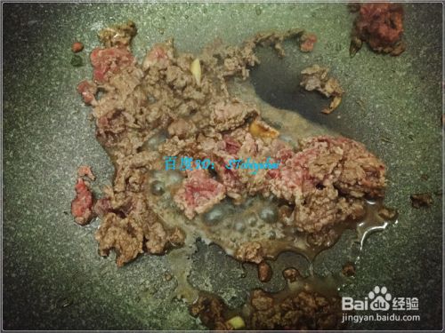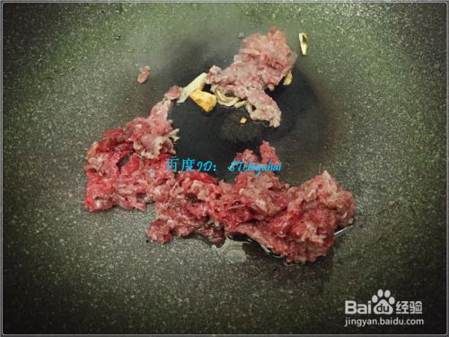 打开电磁炉,加入适量油,放入姜蒜爆香一会,先加入牛肉末炒香,一会加盐、酱油、料酒、醋等调味料,将其炒匀收干,盛出盘中。
