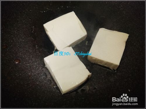 重新往锅内加入少许油,控制小火,将水豆腐块放入煎一会,注意翻转两侧,让其均匀受热。