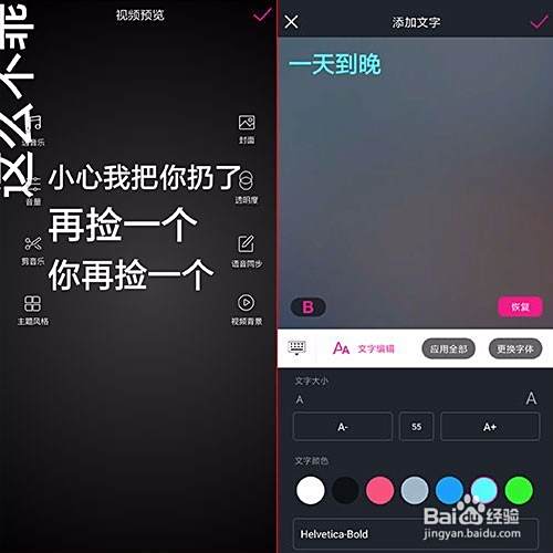 预览页面,觉得声音不合适的,可以给音频变音,另外还可以添加背景乐,更换背景图,视频也可以做背景。双击文字可以编辑文本的颜色,大小,字体等属性,一键编辑轻松搞定,编辑好右上角合成,一个文字视频就制作完成了。