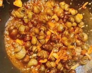 改大火,放螺翻炒均匀,盐白酒生抽白糖翻炒