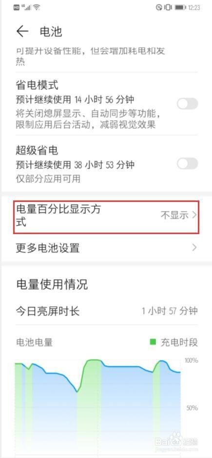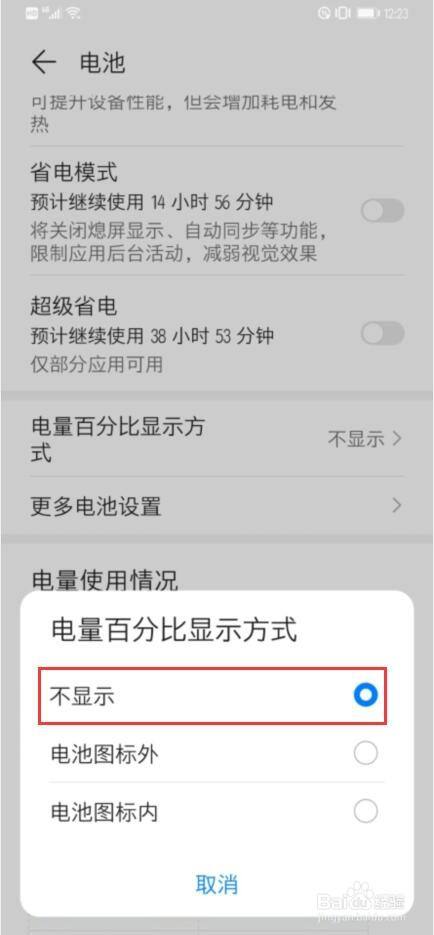 在电池管理界面,找到电池电量百分比方式这一项。此时为不显示。