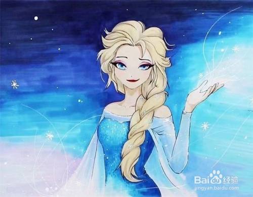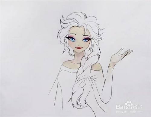 接着画出艾莎的五官,眼睛非常的漂亮,画出她的身体,穿着一字肩的裙子,右手举起来掌心向上摊开。
