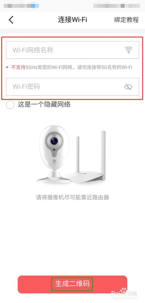 输入手机与摄像头所在的Wi-Fi网络名称、Wi-Fi密码,然后选择“生成二维码”。