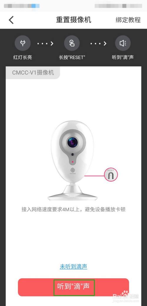 如下截图步骤重置摄像头,红灯长亮→长按“RESET”→听到“滴”声,选择“听到‘滴’声”。