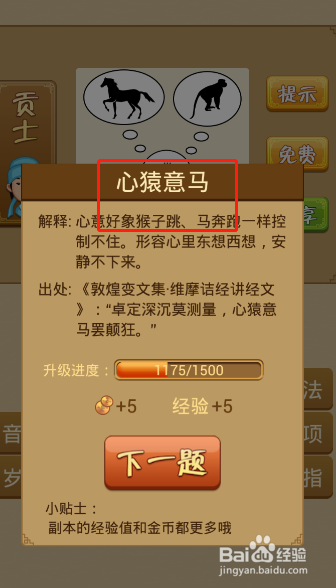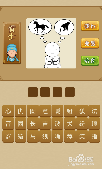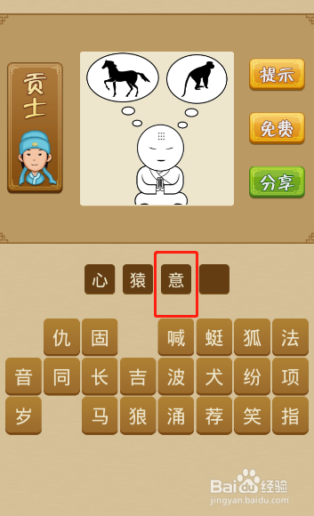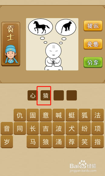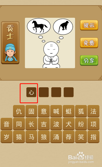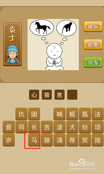 疯狂猜成语第235关中给的图的内容一位和尚师傅心里既想着骏马有想着猿猴,让我们看看这个是什么成语吧?