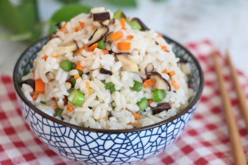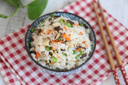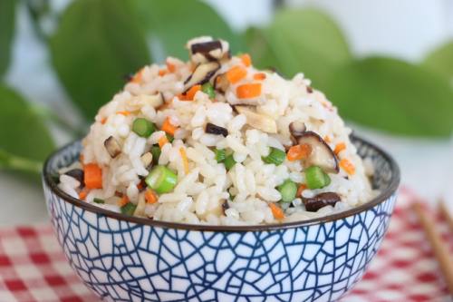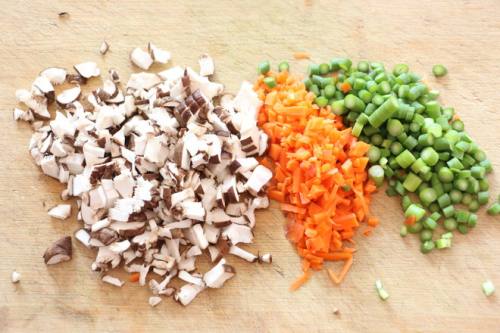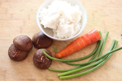 香菇切小丁、胡萝卜切小丁、蒜薹切小丁。