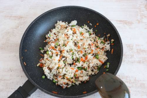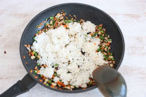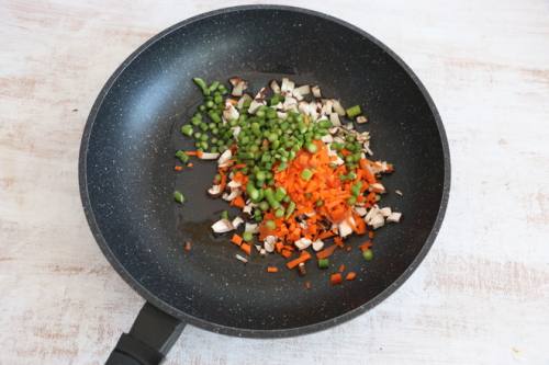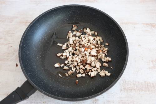 锅内倒入适量食用油,放入香菇丁翻炒。