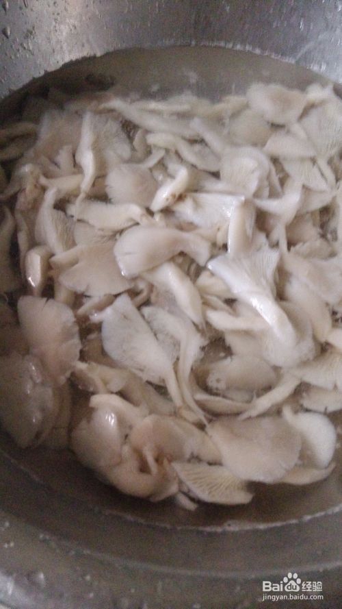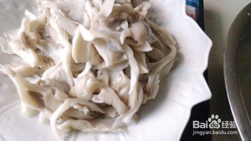 把平菇放在烧开的水里淖5分钟左右,捞出放清水盆内,再捞出挤干水分。