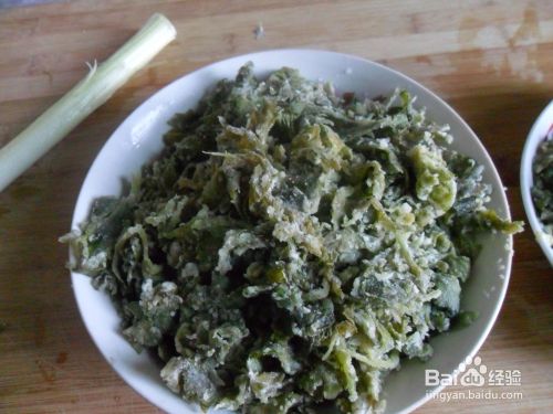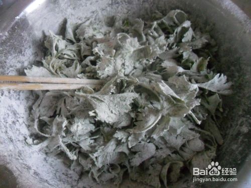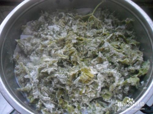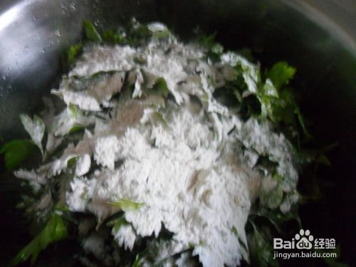 其次,一手将面粉散在洗好的芹菜叶上面,一手用筷子不停的拌,直到所有的叶子都沾上面粉。需要注意的是面粉不要撒太多,太多的整出来会很干,吃着噎得慌,当然也不能太少,太少的话蒸出来黏糊糊的也不好。