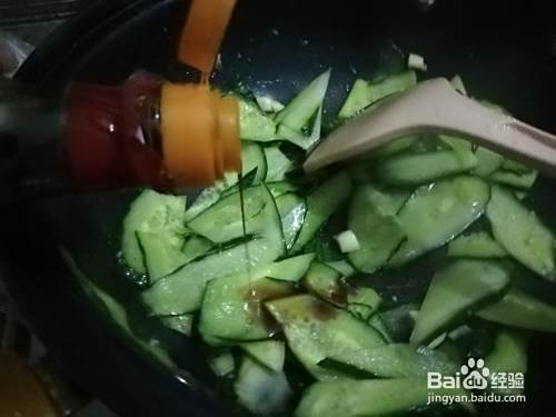 黄瓜炒至变色,差不多熟后,加入调味品酱油耗油和适量的盐鸡精。