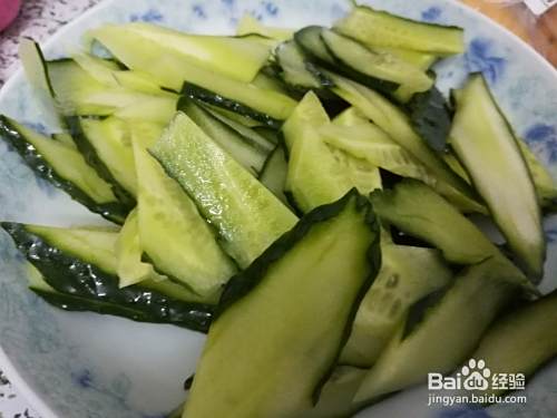 讲黄瓜切成片装入盘中备用,也可以切圆片,看大家的习惯。