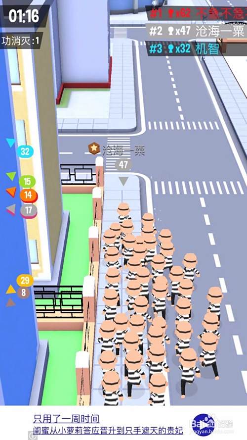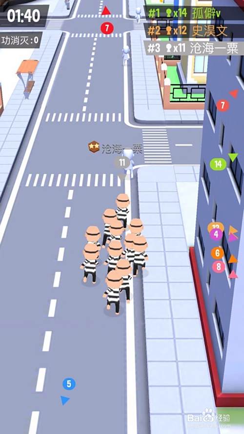 在屏幕的四周,会出现关于其他队伍人数及方位的提醒。因为光靠吞并行人来扩大队伍的话是远远不够的,这时候,你需要寻找人数少于你队伍的队,去吞并其他队伍,与其他队伍接触时的人群密度远远高于街道行人密度,这是你扩大队伍的好机会。同时,你需要避免与人数更多的队伍正面相遇,以防被其吞并~