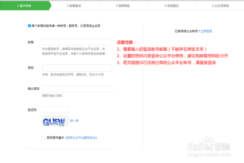 然后一步步填写相关信息就可以了,第一步就是填写基础信息,用一个没有绑定微信的邮箱,填一个自己好记的密码,填好后下一步进行邮箱激活,点击后会自动跳转到邮箱登录界面,点击激活就可以了。