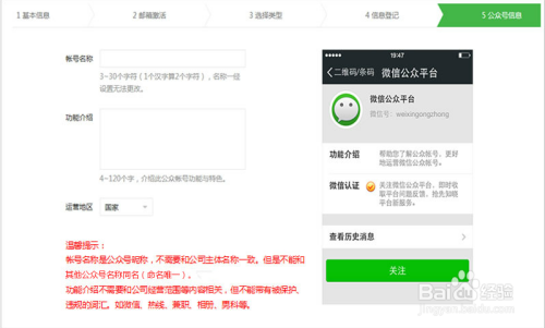 到了最后一步了,填写公众号信息,账号名称,功能介绍以及运营地区,填好后提交即注册成功,就可以进行登录使用了。