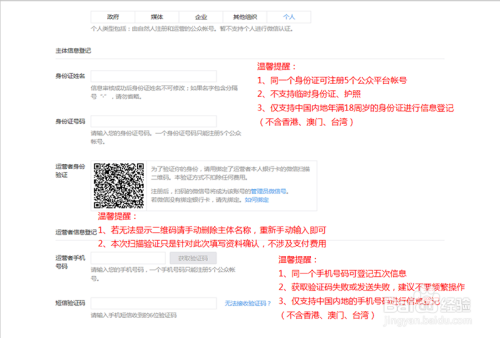 接下来就是信息登记了,个人订阅号需要身份证和手机进行验证,企业号和服务号需要上传相关营业执照进行验证,然后进行提交。