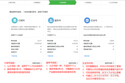 接下来选择公众号类型,个人的就选择订阅号,订阅号后面需要身份证认证,企业的就可以选择服务号或企业号,这两类后边需要企业的营业执照等相关证件认证,根据各自特点谨慎选择,一旦选择不可更改类型。