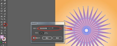 然后在左侧工具栏里,双击混合工具,会出现混合选项,在里面选择指定步数,数值随意(可参考小编的),然后勾上下面的预览,确定