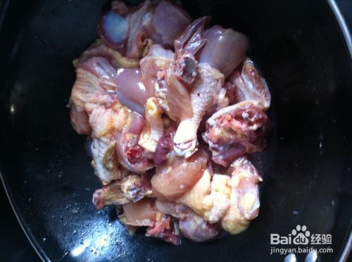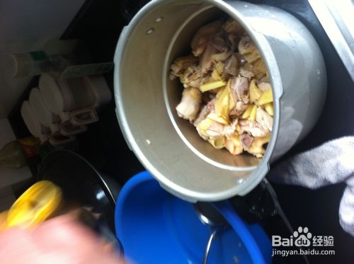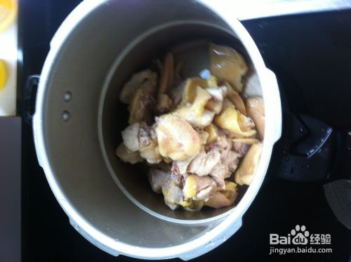 将去过血水的鸡肉洗干净,放入高压锅,然后往高压锅放入水,水盖过鸡肉,往里面放生姜和黄酒和白糖少许