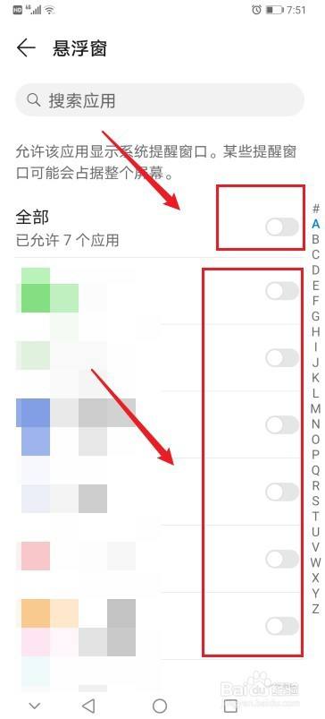在应用列表中,选择应用,将右侧的按钮滑动到开启状态,开启悬浮窗功能。也可将“全部”右侧的按钮滑到开启状态,开启所有应用的悬浮窗功能。