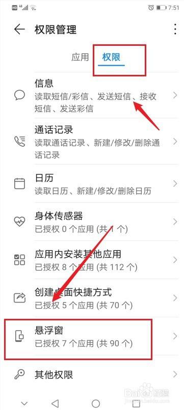 选择“权限”,点击“悬浮窗”。