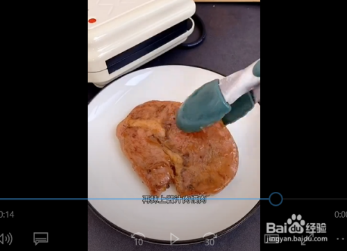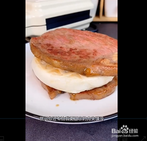 第1步,准备一个大馒头,用早餐机压一下,烤膜就诞生了,把准备好的牛排煎至十二分熟。