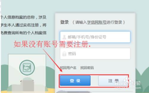 然后,登录学信网账号,如果没有账号需要先进行注册,输入身份证号码、姓名等真实信息。