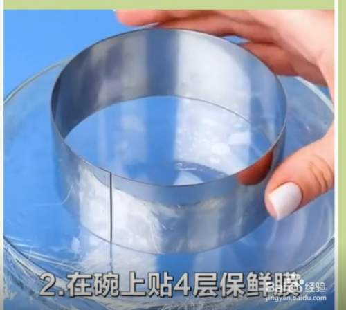 首先在碗上贴上四层保鲜膜,然后放一个圆形磨具,