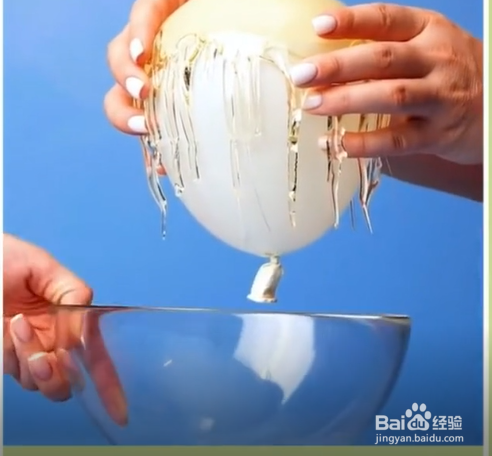首先在装满冰水的气球上多淋几次焦糖,然后把气昆睡爹球里的水放到碗里。