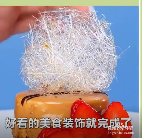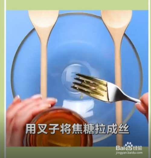 碗上放两个勺子,用叉子将焦糖拉成丝放到上面即可。