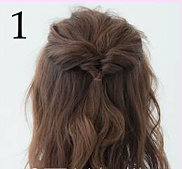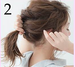 首先,预留好刘海及脸庞两侧的头发,把头顶处的头发扎于脑后,再将橡皮筋以上的头发从中间分出一条小缝,把发束向上翻转从缝间插入再从下抽出,制造出图示的翻卷效果。