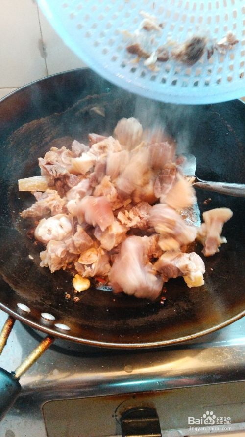 炒一会后将猪蹄盛入深一点的锅中;
