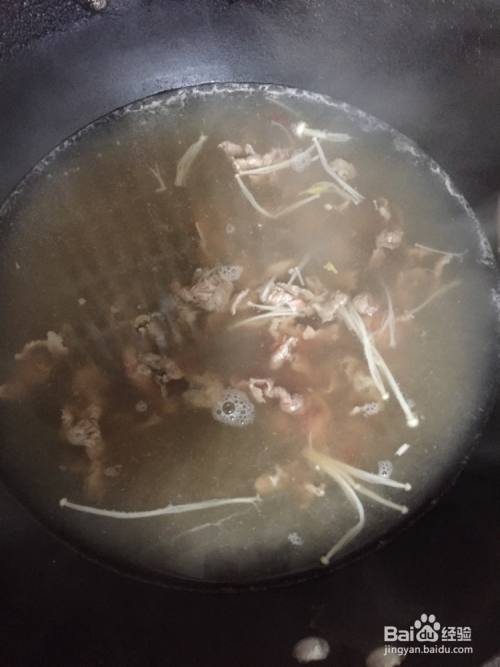 十分钟后把汤过筛,最好用筛勺子过滤干净,再加入蛋黄液,边倒入边快速搅拌,要快速。不然会结块,然后放入金针菇焯水,取出放在碗底,再把肥牛肉焯水放在金针菇上,把蛋黄汤汁倒在碗里
