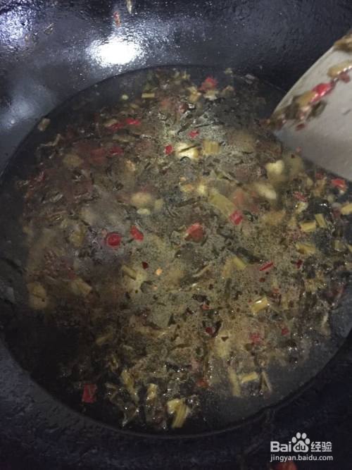 起一个油锅,爆香葱姜蒜泡椒小米椒,放入腌菜五香粉,翻炒片刻,加入一大碗清水和一勺白色香醋,盖上锅盖焖煮10分钟入味,千万别放陈醋还有酱油等有色的料汁.
