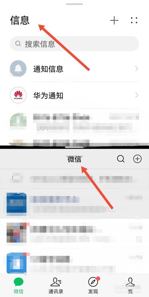 打开微信程序后,滑动左侧竖向项目栏,长按并拉动信息到微信上方,即可显示两个界面