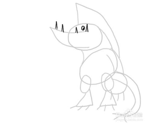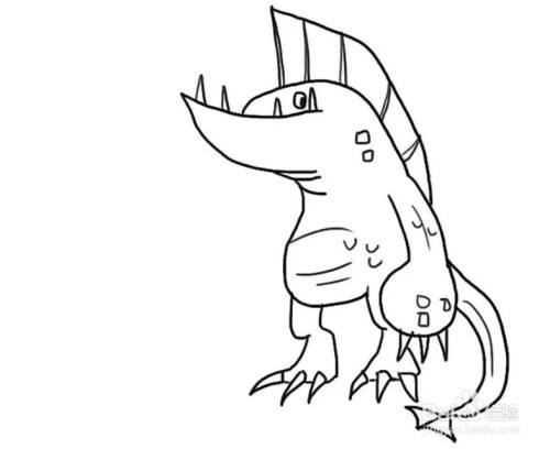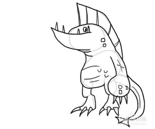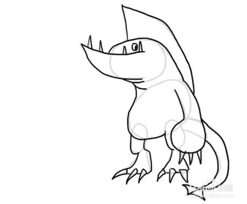 在身体下方画两个竖椭圆,作为大腿。椭圆下方加一个上窄下宽的不规则四边形,作为海怪的脚掌,同样在脚掌上加几段短圆弧作为爪子。
