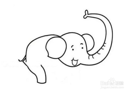 然后从左边耳朵和脑袋的连接处画出大象的后背,从后背延伸到腿部。再画出大象细长细长的尾巴