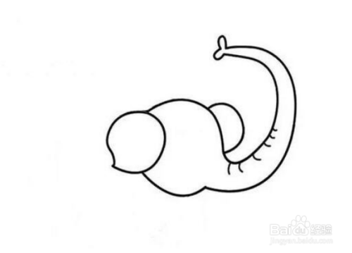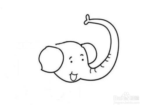 然后画出大象脑袋的结构,鼻子翘起来,鼻子上有褶皱,鼻头微张,在脑袋的右边画出大象的另一只耳朵。