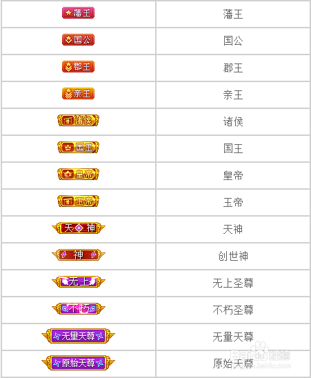 从财富等级来看,用户消耗的虚拟币越多,财富等级也会越高,10级以下是数字等级,10级以上是官位等级,官位等级从低到高依次是:知府、巡抚、总督、少傅、大傅、太傅、贝勒、丞相、藩王、国公、郡王、亲王、诸侯、国王、皇帝、玉帝、天神、创世神、无上圣尊、不朽圣尊、无量天尊、原始天尊,下图显示部分